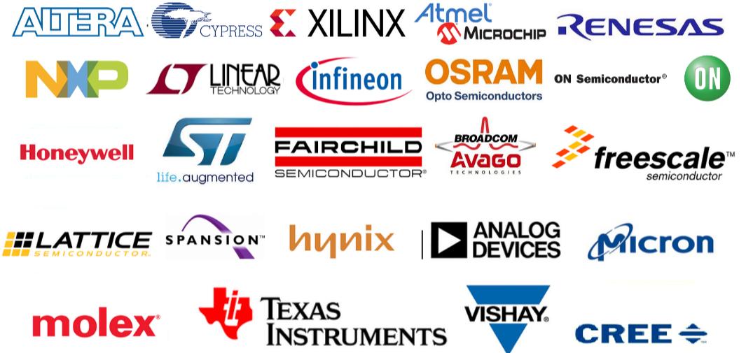 Agere Allegro Altera AMD AMP Amphenol Amplifonix ADI API Delevan Atmel Avago AVX Broadcom Cirrus Logic Conexant Cypress Freescale Fujitsu Fairchild IDT Intel Intersil Infineon IR Isocom ISSI |